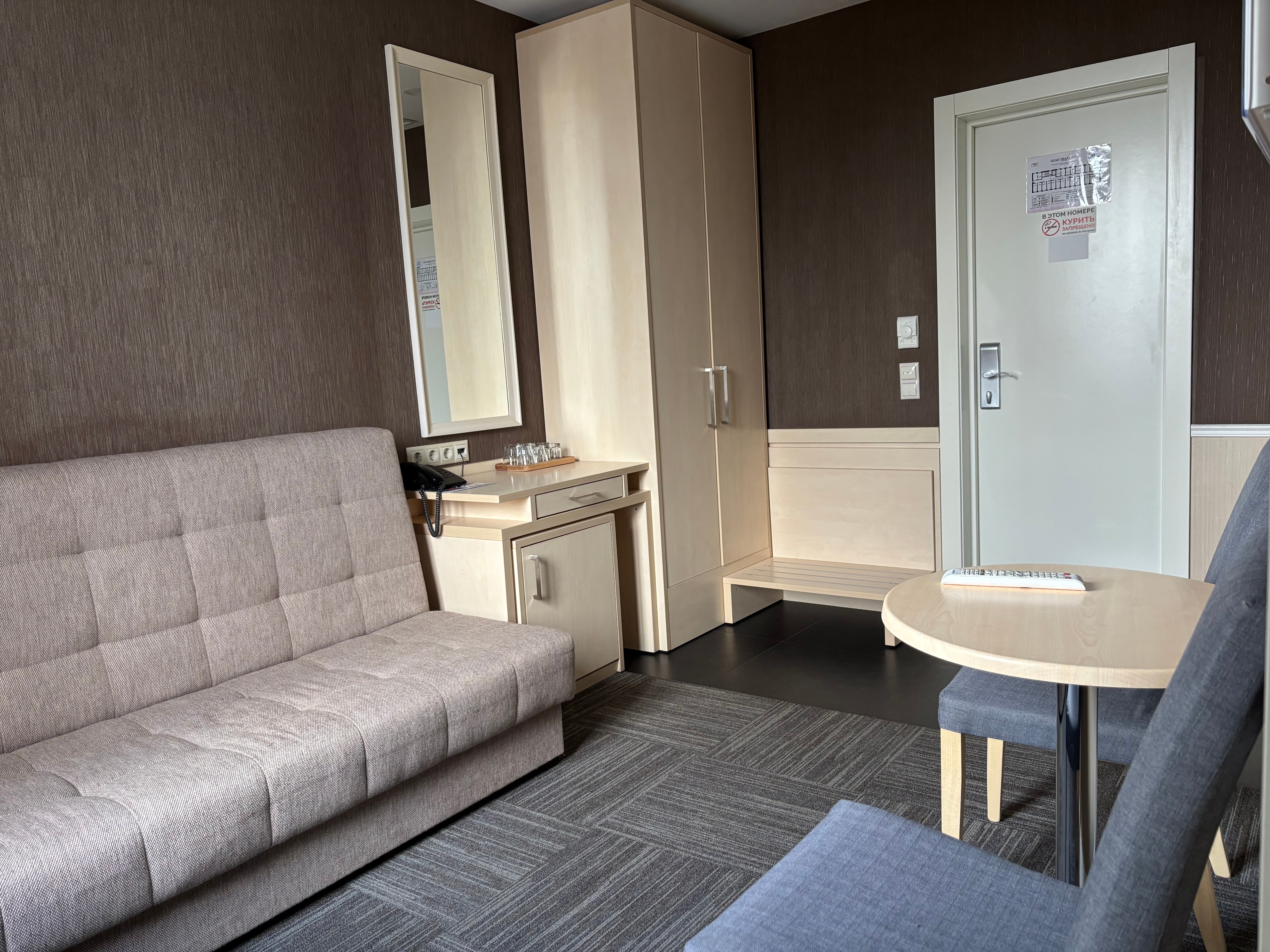В другой комнате: раскладывающийся диван, стол с тумбой и зеркалом, полукресло, шкаф для одежды, полка для багажа, телефон, телевизор, холодильник.