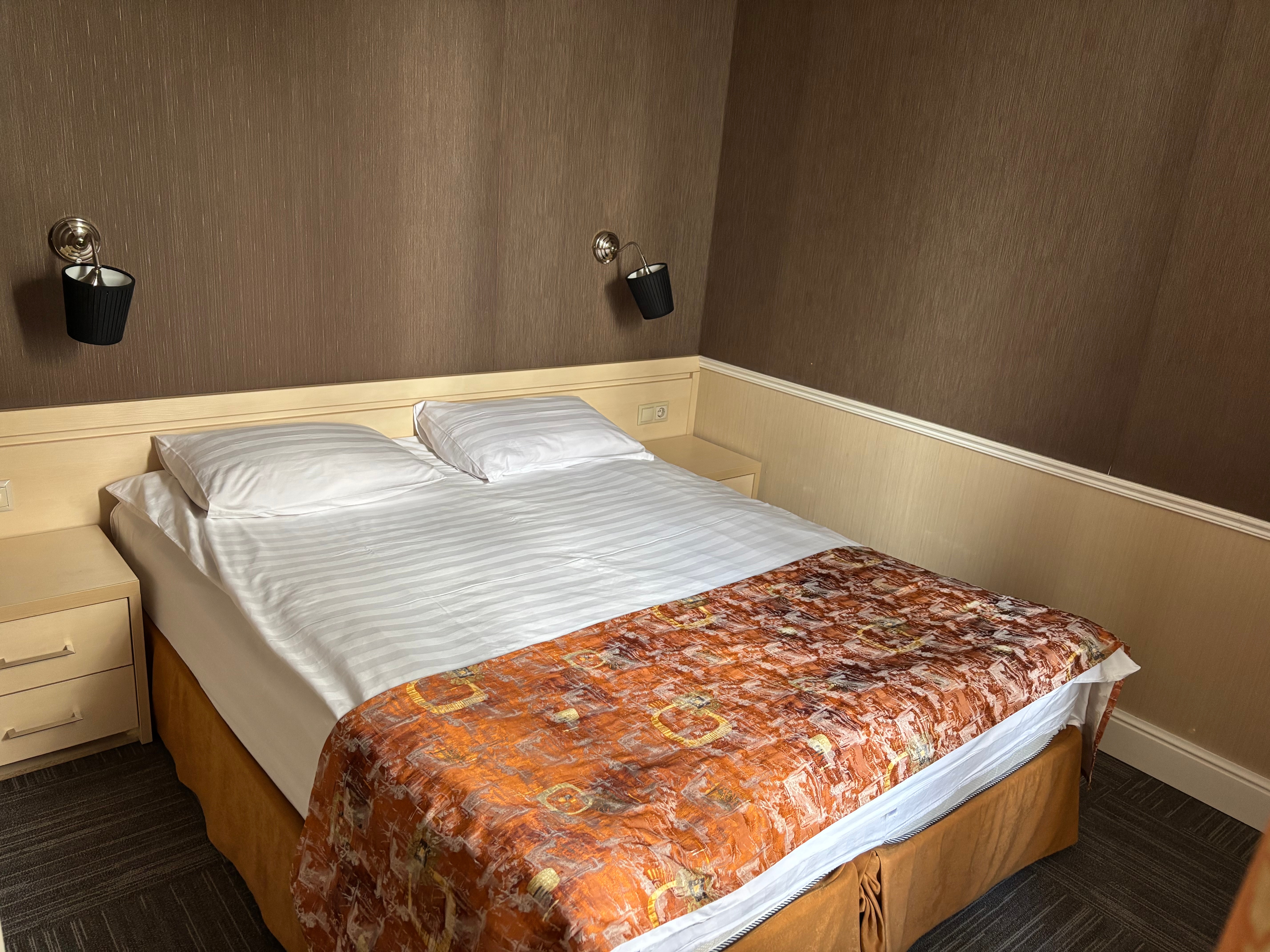В одной комнате: двуспальная кровать, прикроватные тумбочки, настенные бра.